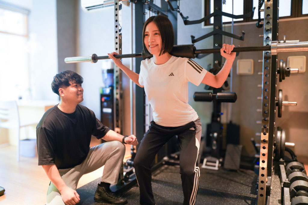 1-2. 「太くなった」と感じる正体 「昔、自己流でスクワットをしたら前太ももがパンパンになった」という経験がある方もいるかもしれません。 これは筋肉がついたのではなく、**「フォームの間違い」による「筋肉の張り(パンプアップ)」と「骨格の歪み」**が原因です。 正しいフォームでお尻や裏もも(ハムストリングス)を使えていれば、脚は太くなるどころか、スラリと引き締まります。だからこそ、自己流ではなくプロの指導が必要なのです。