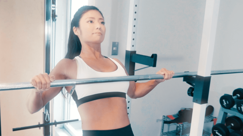 立った状態でバーベルを真上に押し上げるこの種目は、肩(三角筋)だけでなく、体幹の安定性を究極まで高めます。